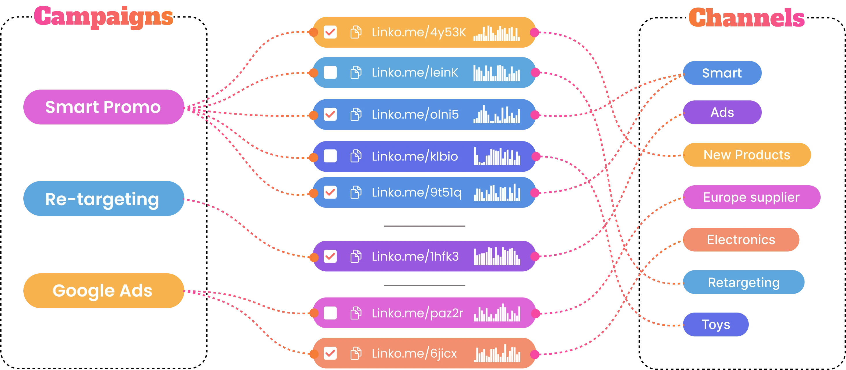Re-organize your links and create distinct campaigns for different promotions. Get aggregated statistics for all links in each campaign and automate your planning and workflow for streamlined management and comprehensive insights.